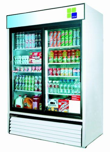Double pane self closing, swing glass doors. Fluorescent light. Eight adjustable PE coated wire shelves. White cabinet with black trim. Bottom mount compressor. Refrigerated Merchandiser Two-section 48 cubic feet Self-contained Double pane self-closing sliding glass doors Fluorescent light Eight adjustable PE coated wire shelves White cabinet with black trim Bottom mount compressor 1/2 HP NSF, UL cUL