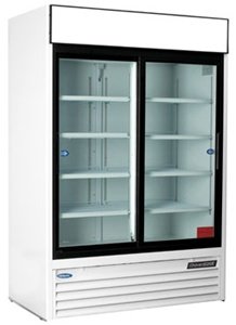 The NorLake NLGR48S AdvantEDGE 2 Door Glass Door Merchandiser has vinyl coated shelves, white exterior and interior, and 2 glass sliding doors for easy viewing.