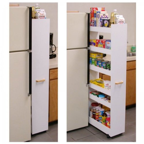 This rolling pantry organizer turns unused areas of the kitchen or pantry into maximum storage space. Because it is on casters this pantry glides effortlessly into small seemingly useless spaces alongside the refrigerator or already loaded cupboards. When recessed you'll hardly know it's there. It is however, extremely sturdy and will stand alone anywhere you put it. Six roomy shelves will accommodate heavy cans, large cereal boxes, spices, bottles and anything else that needs a home. Constructed from durable melamine laminated particleboard. Assembly required. Available in White and Oak finishes. . Made in America